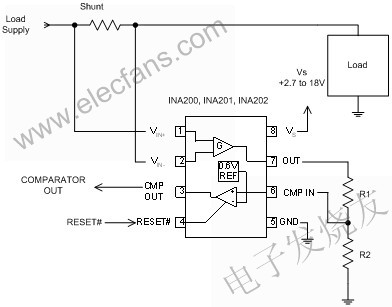 在許多應用中,電流應與某個設定值相比較。通常說來,進行電流比較還需要電流分路監控器、比較器和參考電壓。此外,理想的比較器輸出應與大多數常見的邏輯電路很好地兼容。圖5給出了電流比較的例子。在本例中,將電流與采用TIINA200系列電流分路監控器和比較器的簡單單電壓結點進行了比較。R1和R2形成分壓器,以根據INA200系列比較器的內置0.6V電壓結點來設置電壓結點。(INA200系列的增益很有特點:INA200的增益為20,INA201的增益為50,INA202的增益為100。)