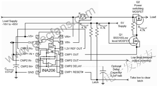 圖6在該雙電平電流比較電路中,低電平延遲輸出可對即將發生的過載發出警報,支持鎖存功能的上限可將負載電源關閉。