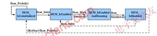 DCM模組遵循的標準與DCM相同,負責直接處理與DTC相關的服務,如UDS中的0x19服務(響應報文由DCM發送出去)。當軟體構件中的MonitorFunction檢測到故障或BSW模組檢測到故障時,將通知DEM模組處理和儲存‘診斷事件’(由EventID進行標識)。如果故障確診,唿叫NVRAMManager(非揮發性記憶體管理器)提供的介面將其存取到非揮發性記憶體中,同時通知應用層進行故障指示。DEM的狀態圖如圖3所示: