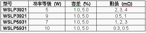 WSLP3921電阻的尺寸為0.394英寸 x 0.205英寸(10.0mm x 5.2mm),最大高度為0.020英寸(0.5mm),WSLP5931的尺寸為0.591英寸 x 0.305英寸(15.0mm x 7.75mm),高度為0.020英寸(0.5mm)。專(zhuān)利的加工工藝使電阻具有0.0003Ω~0.004Ω的極低阻值,以及1.0%和5.0%的嚴(yán)格容差。
