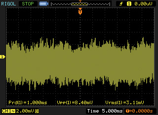 圖3是用示波器測得的某個模數混合電路的模擬部分電源電壓波形,由于示波器的帶寬很大,波形中大部分是數字電路引入的寬帶開關噪聲,幅度為8.4mVpp。一般情況下,8.4mVpp電源紋波和噪聲符合人們的“心理期望”,因而就認為電源沒有問題(電源影響被低估)。