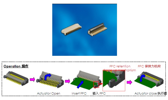 FCI可提供高度最低的FFC/FPC連接器:0.5毫米間距,0.7毫米高度,反向觸發執行器ZIF(零插入力),用于背景燈和觸摸屏連接; 0.2毫米間距,0.9毫米高度,零插入力,適用于顯示器,鍵盤和揚聲器連接。
