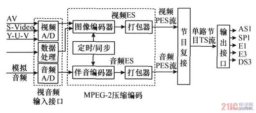 MPEG-2壓縮編碼器是將模擬電視視音頻信號進行MPEG-2壓縮編碼輸出實時TS流的前端設(shè)備,適用于數(shù)字電視的傳輸或前端信源編碼以及會議電視、遠程教育等各種應(yīng)用,一臺高級的編碼器不僅具有DVB接口,還應(yīng)當(dāng)設(shè)有電信接口,以使該設(shè)備能方便地在HFC網(wǎng)絡(luò)、微波MMDS或8GHZ系統(tǒng)、SDH或PDH等網(wǎng)絡(luò)中應(yīng)用,如圖1所示。