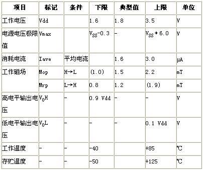 圖2為AS系列的外觀形狀。除了業界標準的SOT23(2.9×2.8×1.2mm),SON4(2.0×2.1×0.6mm)之外,加上超小型的XSON(1.2×1.2×0.4mm),共3種規格,可根據實際空間組合選擇。表1是AS系列的代表產品AS-M15TA-R的規格一覽表,其中最重要的是工作磁場。工作磁場是指輸出信號改變的磁場,為了防止跳躍現象(“高”和“低”在閾值附近反復出現的現象),具有磁滯區間,如圖3所示。除了標準特性外,還具有靈敏度可變,工作電壓的擴大可變等特性。詳細的規格標準就不在此詳述。圖4是為了減少消耗電流進行的抽樣測定的說明簡圖。