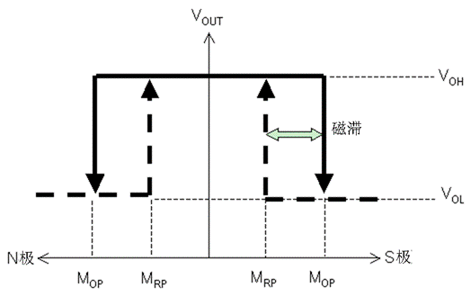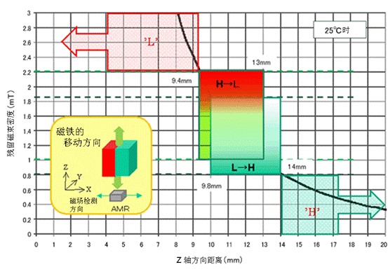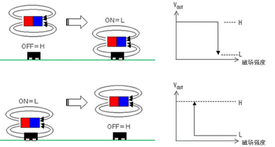 AS系列能夠通過磁鐵和傳感器之間的距離改變來檢測出磁通密度的變化,控制傳感器輸出信號的開關(高(H)<=>低(L)),如圖5所示。當磁鐵接近傳感器,使磁場的強度變大,則傳感器的輸出就會由“高”變“低”,反之則由“低”變“高”。