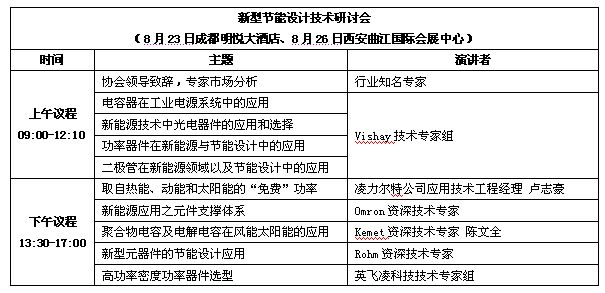 [page]新型節(jié)能設(shè)計技術(shù)研討會以風能太陽能發(fā)電與節(jié)能設(shè)計為主題,圍繞智能電源、逆變器設(shè)計、智能控制、馬達控制、新型電子元器件與模塊的應用展開探討,來自知名廠商的技術(shù)專家將分享逆變器設(shè)計、馬達控制、變頻技術(shù)、電力電子技術(shù)在風能/太陽能、工業(yè)電子、通信設(shè)備、軍工上的應用解決方案和節(jié)能設(shè)計技術(shù)。