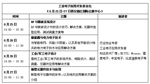 作為2011西部電子論壇中的一個新環(huán)節(jié),論壇組委會將聯(lián)合2011中國(西安)電子展,同期展會2號館推出工業(yè)電子應用開發(fā)者論壇,該活動是2011中國(西安)電子展中的核心活動之一,聚焦以西安為中心的電子行業(yè)最為關(guān)注的RF微波、新能源以及工業(yè)應用等主題,邀請研發(fā)一線的工程師與領(lǐng)先的技術(shù)廠商代表同臺展示設(shè)計新技術(shù)、新思路、新方案,為工業(yè)電子應用開發(fā)者提供深入、平等交流的機會。