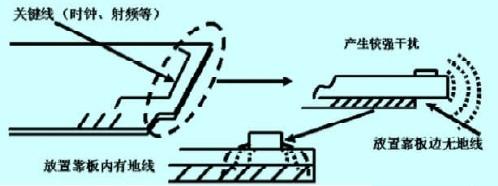 印制電路板的板邊處理是否合理, 決定著是否能夠更加有效地抑制信號的對外干擾。為防止高速數(shù)字電路通過板邊對外干擾, 應(yīng)該嚴格控制其布線位置, 讓其盡量靠近印制板內(nèi)部。高頻等干擾較強信號線不應(yīng)該走到板的邊緣, 以防止無對應(yīng)地層耦合回路, 產(chǎn)生信號對外的干擾泄漏, 如圖3 所示: