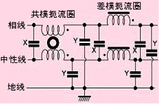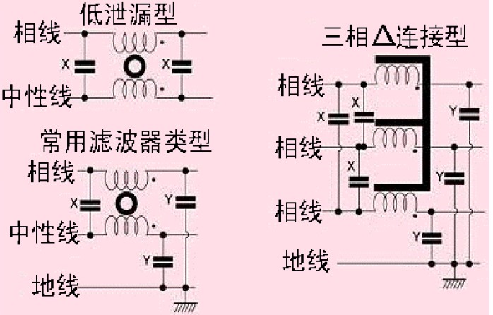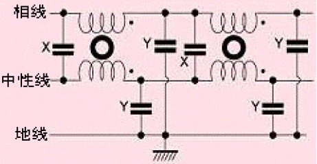 大多數電源線濾波器采用Y型電容,這些電容連接在相線與地線之間。為了不超過相關安全標準限定的地線允許泄漏值,這些電容的值大約在幾nF左右。一般地,Y電容應連接到噪聲干擾較大的導線上(例如,儀表靈敏模擬電路中的電源線,開關電源中的整流器等)。