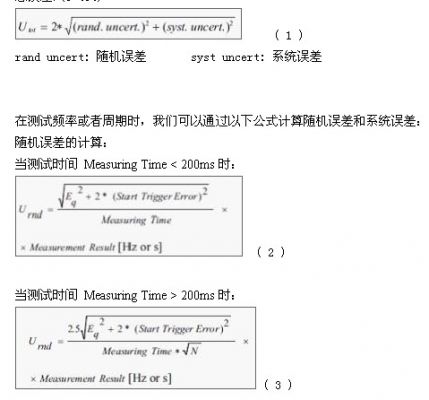 頻率和周期互為倒數,所以在頻率計的測試中,頻率和周期的誤差計算方法是一樣的。從測試誤差的產生來說主要有兩類,一類是隨機誤差,一類是系統誤差。隨機誤差主要由于如噪聲或者一些隨機因素產生的誤差,很難消除。系統誤差主要是由于測試方法、儀表設置或者儀表性能引起的誤差。不同的設備制造商都有自己的關于誤差的計算方法,大同小異,本文論述泰克FCA3000系列頻率計測試誤差的計算方法。
