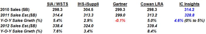 Cowan指出,在這5個最近發布的預測中,有3個都認為2011年該市場的成長仍然會有3,132億~3,134億美元左右; Gartner 較悲觀,預估為2,990億美元;IC Insights 則樂觀地認為會高于3,280億美元。