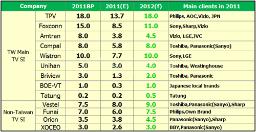 受到品牌需求減少影響,加上部分品牌增加自制比率,臺灣代工廠第三季呈現(xiàn)5.2%之衰退,但經(jīng)過庫存去化及品牌預(yù)拉升年底銷售業(yè)績影響,預(yù)估第四季將有6-9%之成長力道。但整年度看來,TPV(冠捷)還是坐穩(wěn)第一名,明年如能順利掌控PHILIPS品牌,2012年度計劃有可能朝20百萬臺邁進;鴻海(Foxconn)和緯創(chuàng)(Wistron)則受到Sony大幅調(diào)降電視需求影響,今年目標恐難以達成,明年成長力道也將受到限制;仁寶(Compal)、永碩(Unihan)、景智(Briview)主要客戶群皆以日本品牌Toshiba(主要為歐日訂單)為主,日震和歐洲經(jīng)濟困頓,也大大影響其年度績效;瑞軒(Amtran)則受到Vizio波及,整體代工量也未能達標。盡管臺灣電視代工廠有Philips、Sony、Toshiba及Vizio等國際品牌及自有品牌的加持,但還是逃不過大環(huán)境不佳的沖擊。