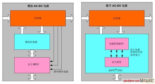 傳統(tǒng)開關(guān)電源(Switch Mode Power Supply,SMPS)控制通常使用純模擬技術(shù)。低成本和高性能數(shù)字信號控制器(Digital Signal Controller, DSC)的出現(xiàn)開啟了開關(guān)電源控制的全新境界,并且標(biāo)志著電源產(chǎn)業(yè)正朝著數(shù)字革命的方向發(fā)展。