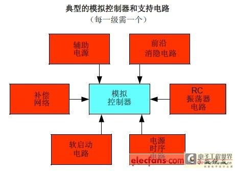 圖1和圖2僅從較高層次展示了兩者的主要差別;然而,在進(jìn)行對比時(shí)所有支持電路也需包括在內(nèi)。圖3 所示為每個(gè)模擬級中的支持電路,而圖4 則為數(shù)字系統(tǒng)中的支持電路。注意模擬控制器所需要的額外連接(在圖3 和圖4 中用箭頭標(biāo)出)。