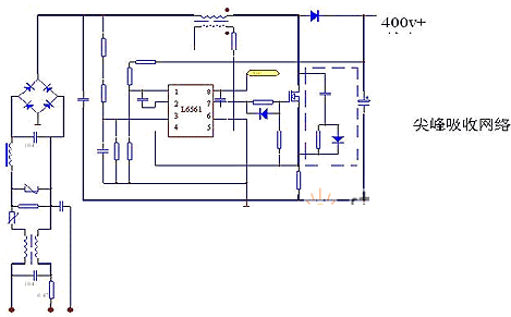 3.在低電壓時(shí),MOS 的升壓電流更大(PWM 輸出導(dǎo)通較寬)MOS 溫升較高。這時(shí)可將電壓范圍設(shè)定為接近值,例如:120v~260v 時(shí)同等負(fù)載測(cè)試時(shí),可將電感的感量及匝數(shù),按照260v 時(shí)的輸入值,設(shè)定并最大可能減少次級(jí)匝數(shù)。在120v 時(shí)可將輸入最低電壓設(shè)定為110v最大限度增加電感感量,使母線在110v 滿載時(shí)輸出達(dá)到額定的400v。在260v 時(shí)設(shè)定次級(jí)是由于輸入電壓升高,輸入電流減小會(huì)使次級(jí)電壓下降,5 腳電流采樣失效,使芯片進(jìn)入重新啟動(dòng)(誤以為空載)母線不斷脈動(dòng)的重新啟動(dòng)。110V 調(diào)試時(shí)感量大,可減少因輸入電壓低而導(dǎo)致的PWM 頻率太高,帶來(lái)的MOS 開(kāi)關(guān)損耗,感量大時(shí)亦可有效減少峰值電流的值。另一減少M(fèi)OS 溫升的方式是并聯(lián)一路吸收網(wǎng)絡(luò)。電阻并聯(lián)高速二極管后在串聯(lián)一只電容可使MOS 開(kāi)關(guān)時(shí)的尖峰反向電壓得到有效吸收。(小功率無(wú)明顯優(yōu)勢(shì))。