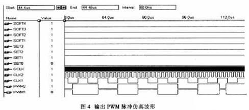 該系統軟件設計是根據系統功能要求而設計的,基于EPM7128的軟件程序設計分為:輸出脈沖占空比調節、頻率調節、軟啟動時間調節和過壓過流報警。開發系統使用VHDL語言進行模塊化編程,這樣可以提高程序的移植性,縮短開發周期,降低開發成本。而且易于維護系統軟件,提高可靠性。圖4是輸出的兩路PWM脈沖仿真波形,其中GCLK是一個基準時鐘源,CLKl和CLK2分別是經VCO轉換的頻率調節和占空比調節信號,SET和SOFT分別是2個外接的4位占空比調節和軟啟動調節撥段開關。