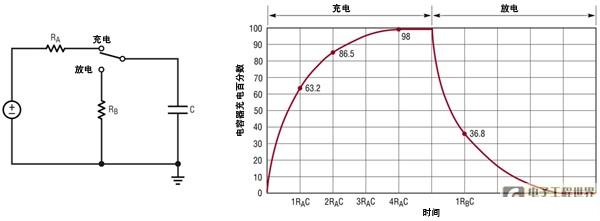 也許最簡單、最常見的電子電路是電阻器和電容器串聯后連接到地所形成的電路。如圖 1 所示,當電壓加在電阻器上時,電容器上的電壓響應會呈現指數規律:VC = VR (1-e-t/),當電阻器接地時,電容器上的電壓響應會呈現類似但反向的指數規律:VC = VINITIAL(e-t/)。這種簡單和可預測的時間響應使這種電路成為濾除噪聲、降低快速信號邊沿速度、保護設備輸入、避免競態情況以及解決其他無數定時問題的理想解決方案。即使沒有給電路添加電阻器或電容器,由于走線或連線中的電阻,這種電路實際上也常常存在。