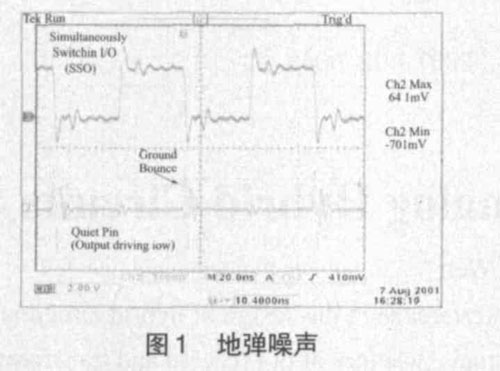 模擬信號(hào)與數(shù)字信號(hào)相比,對(duì)噪聲的敏感程度要大得多,因?yàn)槟M電路的工作依賴連續(xù)變化的電流和電壓,任何微小的干擾都能影響它的正常工作,而數(shù)字電路的工作依賴在接收端根據(jù)預(yù)先定義的電壓電平或門限對(duì)高電平或低電平的檢測(cè),具有一定的抗干擾能力。但在混合信號(hào)環(huán)境中,數(shù)字信號(hào)相對(duì)模擬信號(hào)而言是一種噪聲源。數(shù)字電路工作時(shí),穩(wěn)定的有效電壓只有高低電平兩種電壓。當(dāng)數(shù)字邏輯輸出由高電壓變?yōu)榈碗妷海撈骷慕拥毓苣_就會(huì)放電,產(chǎn)生開關(guān)電流,這就是電路的開關(guān)動(dòng)作。數(shù)字電路的速度越快,其開關(guān)時(shí)間一般也要求越短,當(dāng)大量的開關(guān)電路同時(shí)由邏輯高電平變?yōu)檫壿嫷碗娖綍r(shí),由于地線通過電流的能力不夠,大量的開關(guān)電流就會(huì)引起邏輯地電壓發(fā)生波動(dòng),我們稱為地彈。如圖1 所示。數(shù)字電路造成的地彈噪聲和電源擾動(dòng),如果耦合到模擬電路中,就會(huì)影響模擬電路的工作性能。由于相當(dāng)多的干擾源是通過電源和地總線產(chǎn)生的,其中地線引起的噪聲干擾最大,所以在PCB 設(shè)計(jì)時(shí)對(duì)地和電源的設(shè)計(jì)就顯得尤為重要。