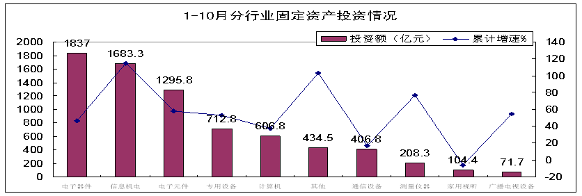 1-10月,在各地大力發展戰略性新興產業的帶動下,電子信息產業固定資產投資保持高速增長,新開工項目明顯增多,基礎元器件領域投資領先增長,行業結構不斷調整。主要特點如下:
