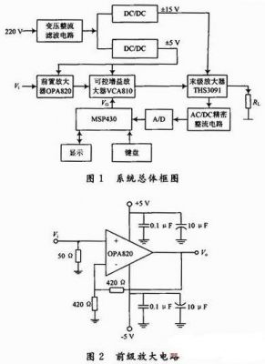 系統組成框圖如圖1所示。系統主要由4個部分構成:前置放大電路、可控增益放大電路、后級功率放大電路和單片機顯示控制模塊。第一級用OPA820ID構成的放大電路增益為6 dB,實現了輸入阻抗匹配;可控增益放大電路由VCA810組成,實現了-40~+40 dB的動態增益變化;后級放大電路增益為14 dB;單片機顯示控制模塊完成對VCA810的控制以及輸出電壓檢測功能并用液晶顯示輸出電壓的峰峰值和有效值。