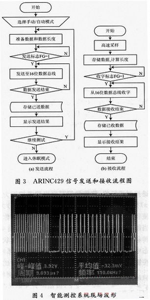 對(duì)此便攜式低功耗雷達(dá)導(dǎo)航儀智能測(cè)控系統(tǒng)的測(cè)試內(nèi)容包括:發(fā)送數(shù)據(jù)、接收數(shù)據(jù)和發(fā)送數(shù)據(jù)間隔等測(cè)試。由于HS3282的兩路輸出是差分輸出的,所以只需要測(cè)試其中的一路就可以了。智能測(cè)控系統(tǒng)現(xiàn)場(chǎng)波形如圖4所示,發(fā)送的數(shù)據(jù)采用自動(dòng)模式,控制字為奇校驗(yàn)。通過(guò)示波器直接觀察HS3282芯片的輸出信號(hào),輸出電平是3.92 V,滿(mǎn)足TTL的電平要求。而數(shù)據(jù)之間的時(shí)間間隔,即組間數(shù)據(jù)4位間隔。由單片機(jī)的延時(shí)程序即可完成。