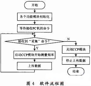 軟件的主要功能就是設置相關的功能模塊來配合硬件實現頻率的采集與數據的上傳,為了達到實時采集的目的,CCP模塊使用中斷方式進行捕捉。測頻儀與PC機采用主從式通信,PIC18F452根據PC機發來的不同指令進行相關的操作,指令共有兩種:開始采集和停止采集。當接收到“開始采集”命令時,PIC18F452就啟動CCP模塊進行頻率的測量并把測量結果通過串口上傳到PC機;當接收到“停止采集”的命令時,PIC18F452就關閉CCP模塊,同時停止上傳數據,然后繼續等待上位機的命令。測頻儀的軟件流程圖如圖4所示。