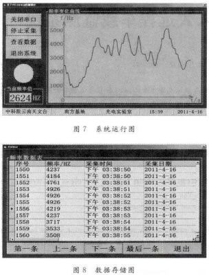 仿真通過之后,就可以按照圖3搭建硬件電路來進行硬件的運行測試。在此使用VB 6.0來編寫上位機軟件,同時配合Access數據庫來存儲PIC18F452上傳的頻率數據。系統的運行效果如圖7,圖8所示。