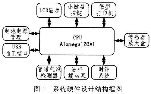 該系統(tǒng)是以ATxmegal28Al微處理器為核心,外圍連接有顯示、按鍵、打印機(jī)、傳感器放大盒、電源、通訊等模塊,其硬件設(shè)計(jì)結(jié)構(gòu)框圖如圖1所示。