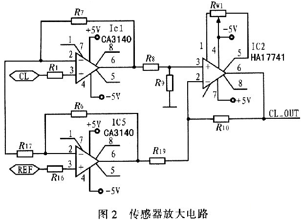 如圖2所示,采用3個(gè)運(yùn)算放大器組成的測(cè)量放大電路,前段有2個(gè)高輸入阻抗的CA3140構(gòu)成差動(dòng)輸入。后端的HAl7741實(shí)際上是一差動(dòng)跟隨器,其增益近似為1。為了保證放大器的精度,負(fù)反饋電阻選擇高精度低溫漂的精密電阻,且電路閉環(huán)增益不太大。同時(shí)為防止電路板表面的漏電流,對(duì)電路板進(jìn)行了局部鏤空。為了能在野外惡劣環(huán)境下工作,對(duì)電路板還進(jìn)行了防潮處理和電子屏蔽。