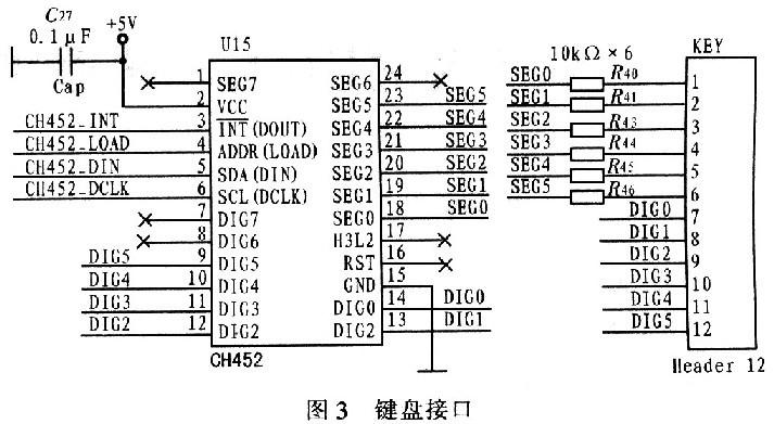 為便于用戶使用,該系統(tǒng)共36個(gè)按鍵,其中有26個(gè)英文字母按鍵、4個(gè)快速功能按鍵、4個(gè)方向按鍵以及確定和取消按鍵,這些按鍵制作成6x6的薄膜開關(guān)按鍵。所有按鍵均有CH452器件控制,這樣可降低主處理器的工作負(fù)擔(dān),大大簡(jiǎn)化了軟件編寫程序。CH452內(nèi)置64鍵鍵盤控制器,基于8x8矩陣鍵盤掃描;內(nèi)置按鍵狀態(tài)輸入的下拉電阻;內(nèi)置去抖動(dòng)電路;鍵盤中斷,可以選擇低電平有效輸出或者低電平脈沖輸出;提供按鍵釋放標(biāo)志位,可供查詢按鍵按下與釋放;支持按鍵喚醒,處于低功耗節(jié)電狀態(tài)中的CH452可以被部分按鍵喚醒。