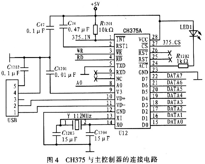 為便于儀器現(xiàn)場(chǎng)使用方便,該系統(tǒng)設(shè)計(jì)了對(duì)外信息輸送的USB接口,可使儀器便捷地與各類存儲(chǔ)器及電腦連接。其中,USB接口控制器采用CH357器件。CH357支持USB-HOST主機(jī)方式和USBDEVICE/SLAVE設(shè)備方式。在本地端CH375具有8位數(shù)據(jù)總線和讀、寫、片選控制線以及中斷輸出,可方便地掛接到ATxmegal28Al微控制器的系統(tǒng)總線上。圖4為CH375與主控制器的連接電路,CH375的TXD引腳直接接地,從而使CH375工作于并口方式。電容C1201用于CH375內(nèi)部電源節(jié)點(diǎn)退耦,采用0.01μF的高頻瓷片電容,可提高接口的EMI要求。電容C47和C1202用于外部電源退耦,采用0.1μF的高頻瓷片電容。晶體X11、電容C1203和C1204用于CH375的時(shí)鐘振蕩電路。USB-HOST主機(jī)方式要求時(shí)鐘頻率比較準(zhǔn)確,X11的頻率是12 MHz±0.4‰,C1203和C1204是容量約為15 pF的獨(dú)石電容。LEDl為數(shù)據(jù)傳送指示燈,用戶可以直觀觀察數(shù)據(jù)傳送狀態(tài)。