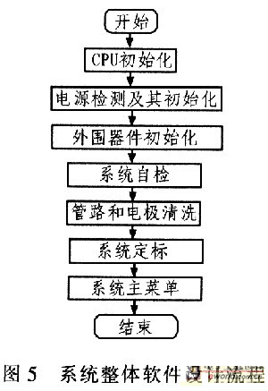 該系統(tǒng)軟件開發(fā)采用ATMEL公司提供的AVRStudio開發(fā)環(huán)境,并在該開發(fā)環(huán)境中內(nèi)嵌了支持C語(yǔ)言的GCC。分析儀軟件全部采用C語(yǔ)言編寫,這樣開發(fā)周期縮短,維護(hù)便捷。該系統(tǒng)軟件設(shè)計(jì)采用層次化模塊化結(jié)構(gòu)設(shè)計(jì),共分為兩個(gè)層次,第l層是按照硬件各個(gè)功能模塊編寫相應(yīng)的驅(qū)動(dòng)和接口程序,包括液晶顯示、打印機(jī)、按鍵處理、步進(jìn)電機(jī)、A/D采集轉(zhuǎn)換、系統(tǒng)時(shí)鐘、檢測(cè)和電源管理等模塊;第2層是在第1層的基礎(chǔ)上按照使用功能編寫的應(yīng)用程序模塊,有主菜單、樣本分析、質(zhì)控分析、質(zhì)控統(tǒng)計(jì)、系統(tǒng)設(shè)定、系統(tǒng)校準(zhǔn)、電極清洗、數(shù)據(jù)儲(chǔ)存及查詢和系統(tǒng)自檢等模塊。圖5中給出系統(tǒng)整體軟件設(shè)計(jì)流程。