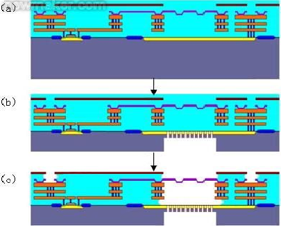 下圖簡(jiǎn)述了Post-CMOS MEMS的制造方式。在Post-CMOS MEMS工藝中需特別注意,不能讓額外的熱處理或高溫工藝影響到CMOS組件的物理特性及MEMS的應(yīng)力狀態(tài),以免影響到振膜的初始應(yīng)力。鑫創(chuàng)科技公司克服了諸多的技術(shù)難題,完全采用標(biāo)準(zhǔn)的CMOS工藝來(lái)同時(shí)制造電路元件及微機(jī)電麥克風(fēng)結(jié)構(gòu)。在CMOS部分完成后,將芯片的背面研磨至適當(dāng)厚度以符合封裝要求。最后,利用氫氟酸溶液(HF)去除犧牲氧化物來(lái)釋放懸浮結(jié)構(gòu)。此外,在設(shè)計(jì)中還需考慮可完全去除犧牲材料而又不損害麥克風(fēng)振膜的蝕刻方法,并應(yīng)避免麥克風(fēng)振膜與背電極板之間產(chǎn)生粘黏現(xiàn)象。
