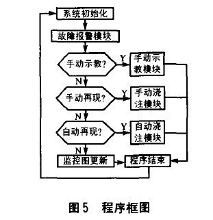 系統上位機監控軟件采用西門子公司WINCCV5.0軟件,運用該軟件設計顯示澆注軌跡及示教參數輸入等,中文人機界面,操作方便。