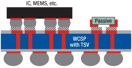 隨著 WCSP 的發(fā)展,我們將見證 TSV 互連技術(shù)的融合,其提供有源端到裸片后端的電氣連接。這種能力允許 IC 或者其他組件(MEMS、無源組件等)堆疊,從而構(gòu)建起高集成度的芯片組或者系統(tǒng)級封裝 (SiP) 系統(tǒng)。