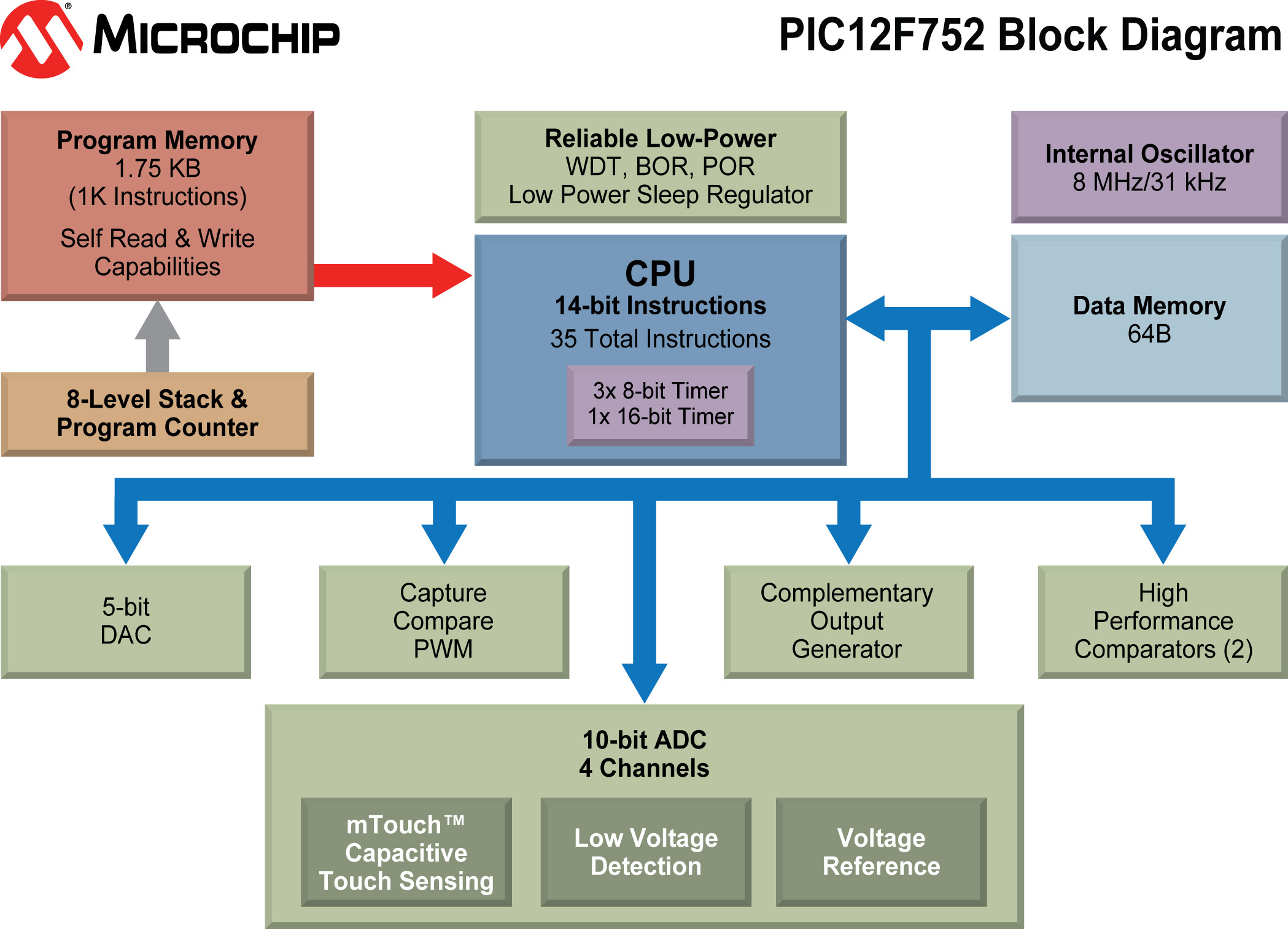 工程師們始終面臨著在降低系統(tǒng)成本同時(shí)提高系統(tǒng)性能和效率的挑戰(zhàn),特別是新近的LED照明和電池充電應(yīng)用。憑借集成的COG、高性能比較器、可直接驅(qū)動(dòng)MOSFET的50 mA輸出等豐富的片上通用和專用外設(shè),PIC12F(HV)752 MCU能夠滿足這些需求。PIC12HV752 MCU是該系列中的高電壓型器件,集成了并聯(lián)穩(wěn)壓器,使器件可在2V至未指定用戶定義最大電壓下工作,其工作電流小于2 mA。這一高電壓型器件是采用高電壓電源軌的成本敏感型應(yīng)用的理想選擇。此外,4通道10位ADC可用來實(shí)現(xiàn)各種傳感器和mTouch™ 觸摸傳感應(yīng)用,包括電容式觸摸。