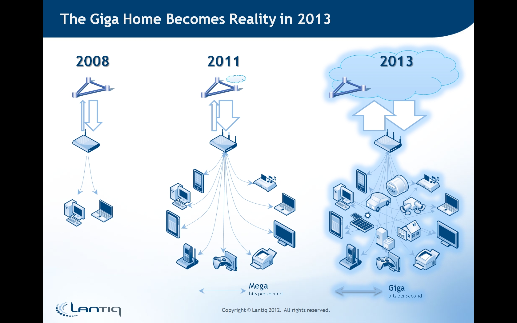 在家庭之中,對帶寬的需求持續(xù)不斷地增長。平板電腦、智能手機、PC、網(wǎng)絡(luò)存儲設(shè)備(NAS)、電視和游戲機都需要可靠且快速的高數(shù)據(jù)流量。所有的這些設(shè)備都相互連接并聯(lián)到互聯(lián)網(wǎng)中,當添加了云計算和HDTV/IPTV流媒體服務(wù)時,寬帶網(wǎng)絡(luò)中的數(shù)據(jù)需求將爆發(fā)。