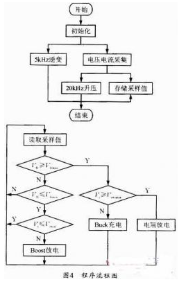 按照上述控制策略,得到如圖4的程序流程圖,其中5kHz逆變?yōu)榫鶋弘娐分械哪孀兤鳎捎?0%的PWM脈沖波來(lái)實(shí)現(xiàn),不需要復(fù)雜的控制算法。20kHz升壓模塊完成開(kāi)關(guān)管S1信號(hào)的產(chǎn)生。需要通過(guò)電壓采集電路,得到串聯(lián)電容的總電壓。4個(gè)判斷模塊通過(guò)判斷Vdc和Vc的電壓范圍決定對(duì)電容的充放電控制。