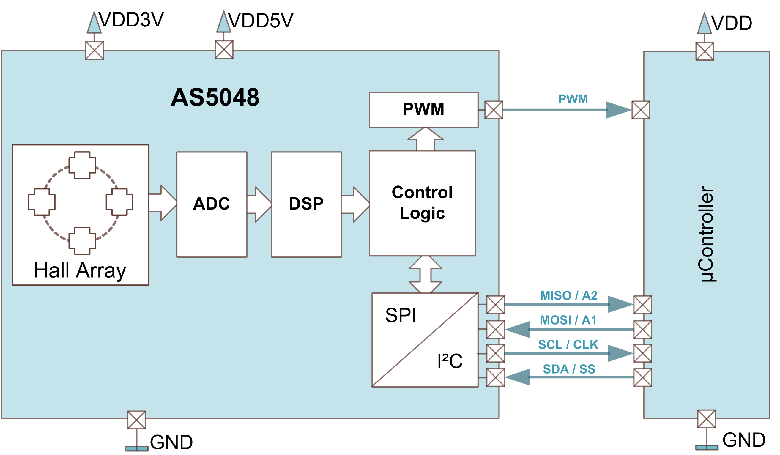 AS5048提供PWM輸出以及SPI或I2C接口,為微控制器提供絕對角度測量。在進(jìn)行機械設(shè)計時無須考慮芯片初始零位和它 所使用磁鐵磁極的精確配對,取而代之的方案是:零位早在組裝時通過簡單的SPI或I2C命令(無需特殊的編程設(shè)備)即可編程進(jìn)AS5048內(nèi)部的存儲器。