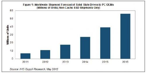 據IHS iSuppli公司的存儲市場簡報,隨著固態硬盤(SSD)的成本下降,以及超級本(Ultrabook)等產品的需求給其帶來活力,PC OEM廠商可能會增加使用SSD,從而進一步擴大其出貨量。