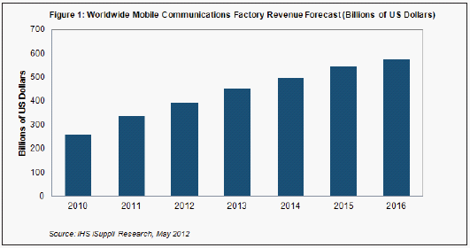 上述預(yù)測數(shù)據(jù)由無線通信產(chǎn)業(yè)各領(lǐng)域中的OEM廠商的總體工廠營業(yè)收入構(gòu)成,包括手機、媒體平板和移動基礎(chǔ)設(shè)備等主要領(lǐng)域,以及無線路由器、無繩電話、電池充電器和灰市手機等輔助領(lǐng)域。