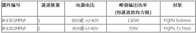 單通道IR4301M及雙通道IR4302M有助于設計師在各種通道配置內靈活安裝立體聲放大器及進行多通道設計。這兩個器件分別采用5×6 mm和7×7 mm PQFN封裝,有助于彰顯使用較小D類拓撲的優勢。