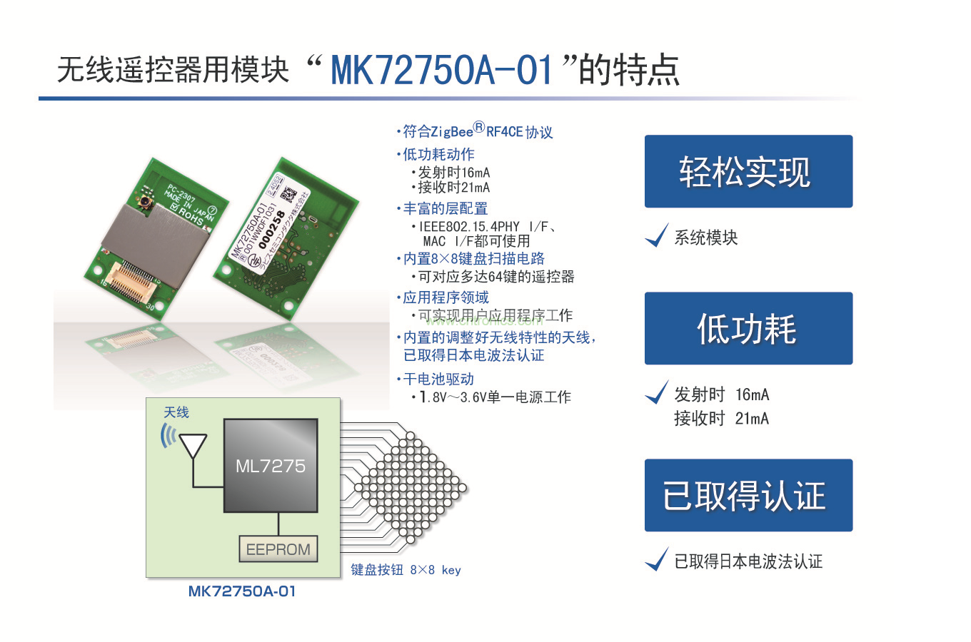 羅姆集團旗下的LAPIS Semiconductor,面向無線遙控器市場,開始出貨符合ZigBee®RF4CE注1協(xié)議的2.4GHz無線通信模塊“MK72750A-01”的樣品。本模塊作為無線通信LSI,內(nèi)置了本公司生產(chǎn)的符合ZigBee®RF4CE協(xié)議的LSI “ML7275”,是內(nèi)置調(diào)整好無線特性的天線的模塊。使用這款內(nèi)置了以業(yè)界頂級低功耗(信號發(fā)射時16mA, 信號接收時 21mA)著稱的“ML7275”的無線遙控器,無需高頻電路設計和無線特性調(diào)整所必須具備的專業(yè)技術、開發(fā)經(jīng)驗,即可輕松開發(fā)。本商品計劃于5月份開始出貨樣品,8月份開始量產(chǎn)銷售。