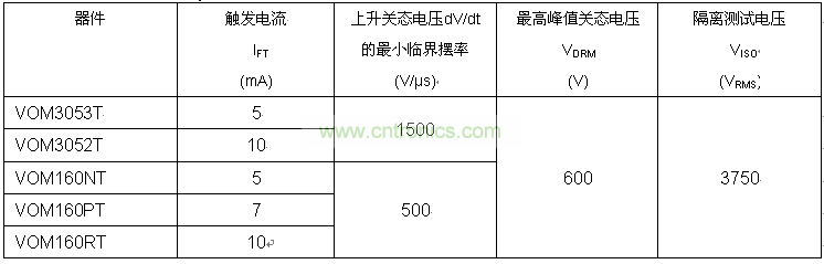 VOM3052T和VOM3053T具有高達(dá)1500V/μs的靜態(tài)dV/dt,尤其適用于噪聲環(huán)境。在這些地方,即使在輸入端沒(méi)有任何觸發(fā)信號(hào),由于在輸出負(fù)載上存在高擺率瞬態(tài),較低的dV/dt可能引起晶閘管觸發(fā)。