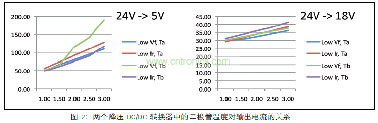 圖 2 還清楚地顯示輸入輸出電壓比。左圖顯示低占空比5 V輸出的D C / D C 轉(zhuǎn)換器。在較低的占空比時,T2的時間較長,功耗也較高。這反過來使二極管更熱,使得Ir增加地更大,因此PT1變得更高??偟慕Y(jié)果是:在輸出電流增加時,二極管的溫度會很快地升高。在電流較高時,溫度實際上已經(jīng)超過了二極管規(guī)定的工作范圍。在圖 2 的右側(cè),較高的輸出電壓18V時,它的占空比也比較高,這使得PT2損耗保持在可控制范圍內(nèi)。二極管上產(chǎn)生的熱量較少,使得Ir增加的幅度較小,因此,PT1會更少,并且整體溫度升高幅度較小。