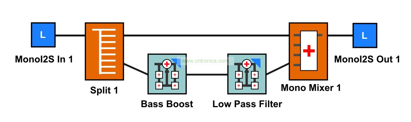 如果增頻頻率大體上較低,則請嘗試在增益級后面增加一個低通濾波器,以降低限幅引起的高頻。在模擬系統中,使用足夠高的截頻速率來構建這種低通濾波器通常要求有一個多階濾波器,從而讓系統變得體積龐大且成本高昂。但是,在數字處理系統中卻可以輕松實現,條件是在音頻處理器中有足夠的有效MIPS。圖2 顯示了軟限幅時一個處理流程的例子。