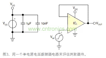 為更好地理解違反VICMR的效果,下面給出一些實(shí)例。用兩只具有不同VICMR規(guī)格的運(yùn)放可演示這些效果。這些器件都有軌至軌的輸出,排除了輸出級(jí)造成的限制。一個(gè)單電源的電壓跟隨器電路用于兩只器件的評(píng)估(圖3)。所有測(cè)試均在一個(gè)實(shí)驗(yàn)臺(tái)上完成,室溫約為25°C。
