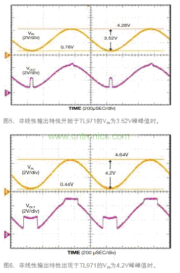 第二個(gè)例子使用一只TL971軌至軌輸出的電壓跟隨器電路,但結(jié)果卻不同。此時(shí),運(yùn)放采用一個(gè)單5V電源。從數(shù)據(jù)表規(guī)格可知,有保證的VICMR區(qū)間跨越了1.15V~ 3.85V范圍,或中心在VCC/2的大約2.7V峰峰值。輸入端加的是一個(gè)直流偏移為2.5V的1kHz正弦波。將VIN的幅度從200mV峰峰值調(diào)向更高電平,直到看到VOUT的變化。