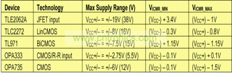 表1列舉了幾個德州儀器(TI)運算放大器的例子及其VICMR。“最大電源范圍”欄描述了分裂式電源和單電源(括號內)限制。由該表,我們清楚地知道各運算放大器的輸入范圍VICMR明顯不同。根據器件的具體類型,VICMR可能會低于或者超出電源軌。因此,絕不要假設運算放大器可以接收特殊輸入信號范圍,除非在產品說明書規范中得到核實。