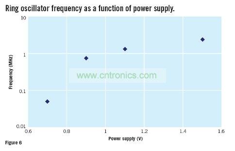 除了具備足夠的工作性能外,根據以上要求,這些設備還需具備低斷態漏電電流。這就意味著在這種工藝技術中必須權衡性能與漏電。一般來說,這些工藝的柵極長度在130nm到350nm之間,將來也可能達到到90nm。對于可移植設備而言,漏電流性能可隨工藝、溫度或電源的變化而變化,這是一個重要參數,因為它將直接影響電池的使用壽命。圖4顯示了采用NMOS工藝設備的漏電流(Ioff)與驅動電流(Idrive)隨溫度變化而變化的情況。Idrive與溫度變化關系不大,而Ioff則具有顯著的溫度相關性。圖5是PMOS設備的溫度相關性圖。由于溫度變化幅度不大,Ioff隨溫度變動的情況可以接受。圖6所示的是環形振蕩器頻率,是一項顯示設備電源電壓功能典型的品質因數,在實際應用中也可作為權衡漏電與性能的準則。